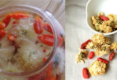 5 Fleurs de chrysanthèmes - (Ju Hua): favorise légèrement l'extériorisation du Qi et la circulation du Qi du Foie, élimine le vent chaleur et la chaleur du Foie